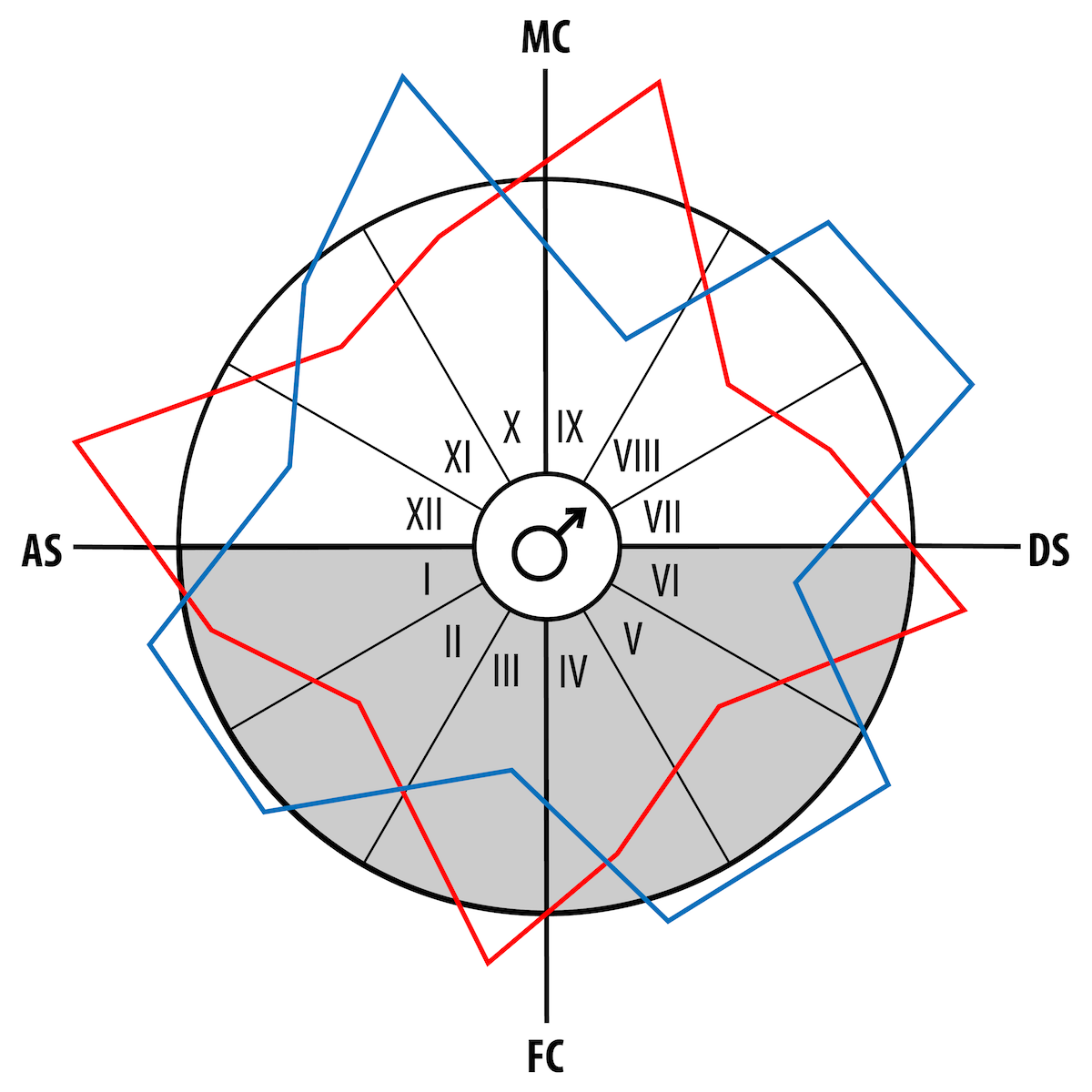 Fig. 4 : positions de Mars chez 570 sportifs connus au moral d’acier (en rouge) ou au moral fragile (en bleu). Cercle : moyenne théorique. Statistique portant sur des naissances avant 1960.