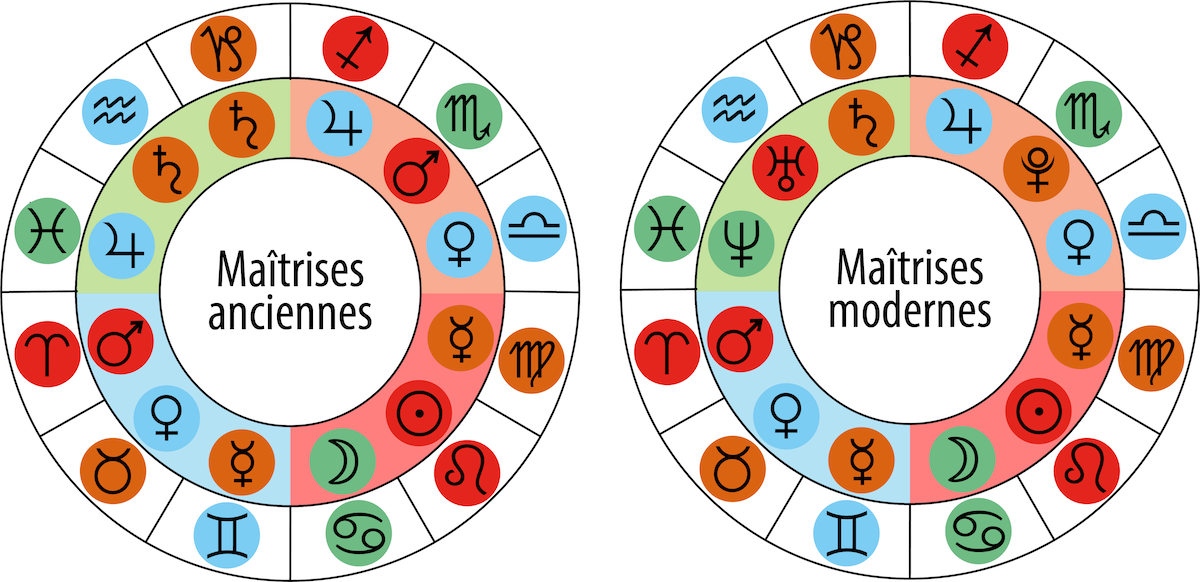 Fig. 4 : Maîtrises anciennes et modernes et doctrine des 4 Éléments. On observe que dans la version ancienne seuls 4 Signes sont les Domiciles d’une Planète de même Élément. Dans la version moderne, le score s’améliore un peu puisque 5 Signes font de même grâce à l’introduction de Neptune comme Maître des Poissons. La logique la plus… Élémentaire demanderait pourtant que l’attribution d’un même Élément à un Signe et à la Planète qui le “maîtrise” soit une règle générale !